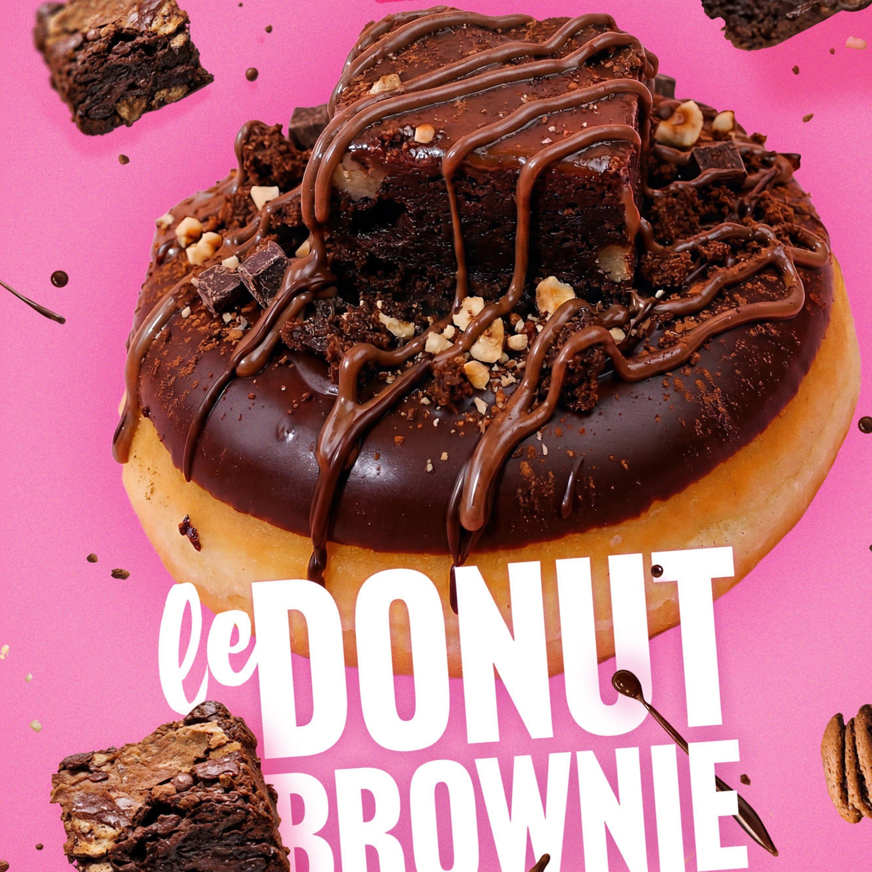 Un donut ultra gourmand nappé de chocolat, surmonté d’un brownie fondant, avec des éclats croquants…